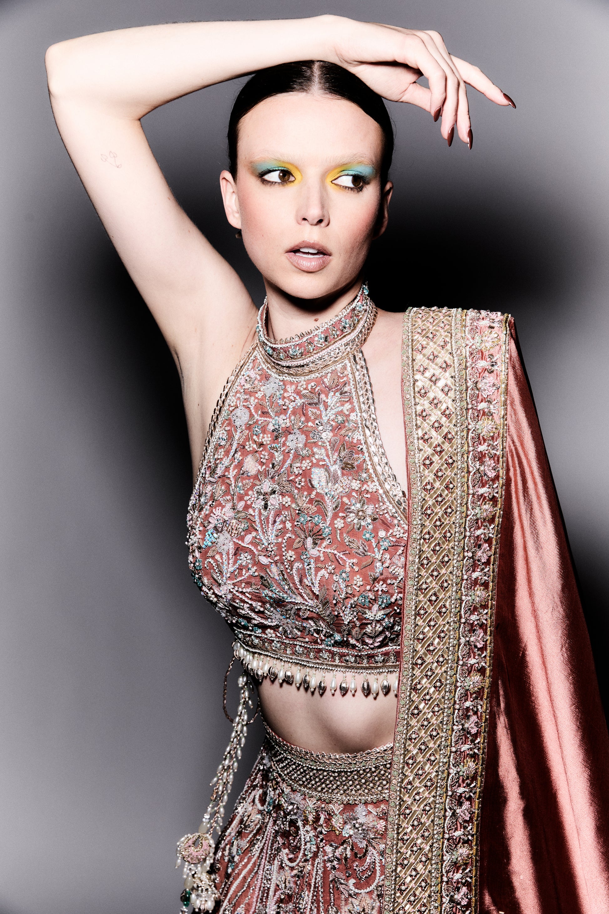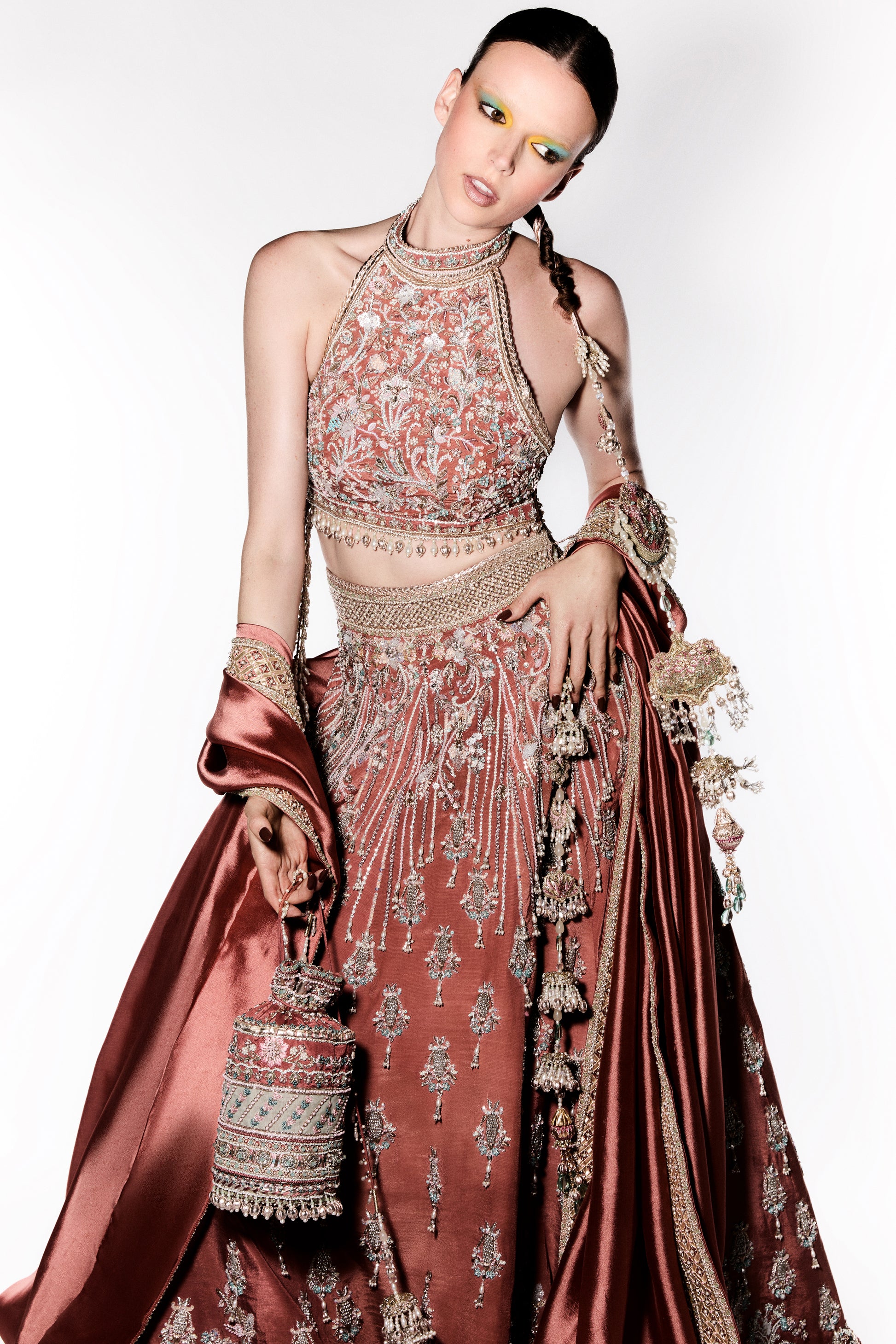 Coral Symphony is a stunning coral lehenga and halter top ensemble, intricately embroidered with vibrant fish and floral motifs that reflect the lively energy of the ocean. The gown is adorned with hand-applied dabka, tilla, glass beads, REESHAM thread, gota work, and Swarovski crystal beads, creating a perfect fusion of texture and radiance.