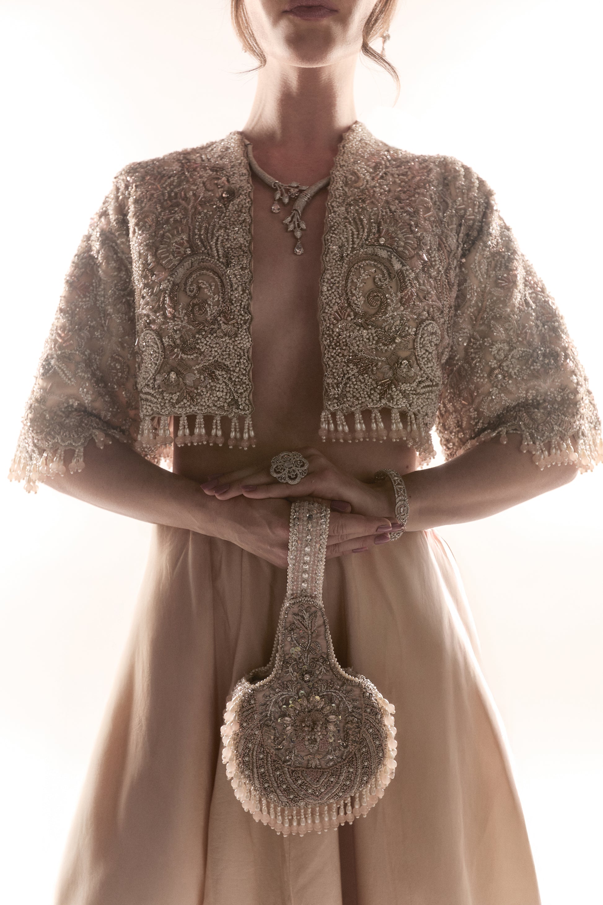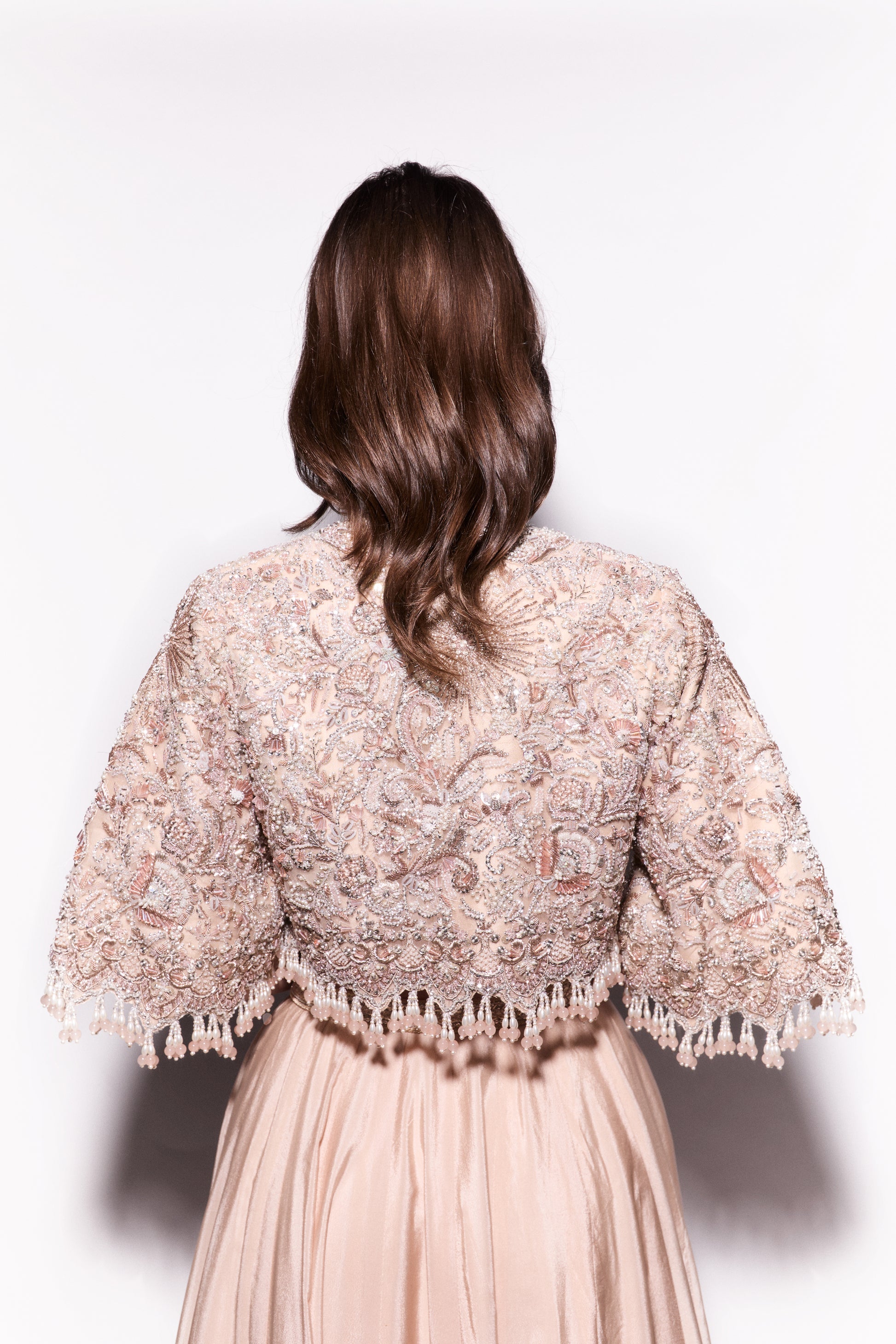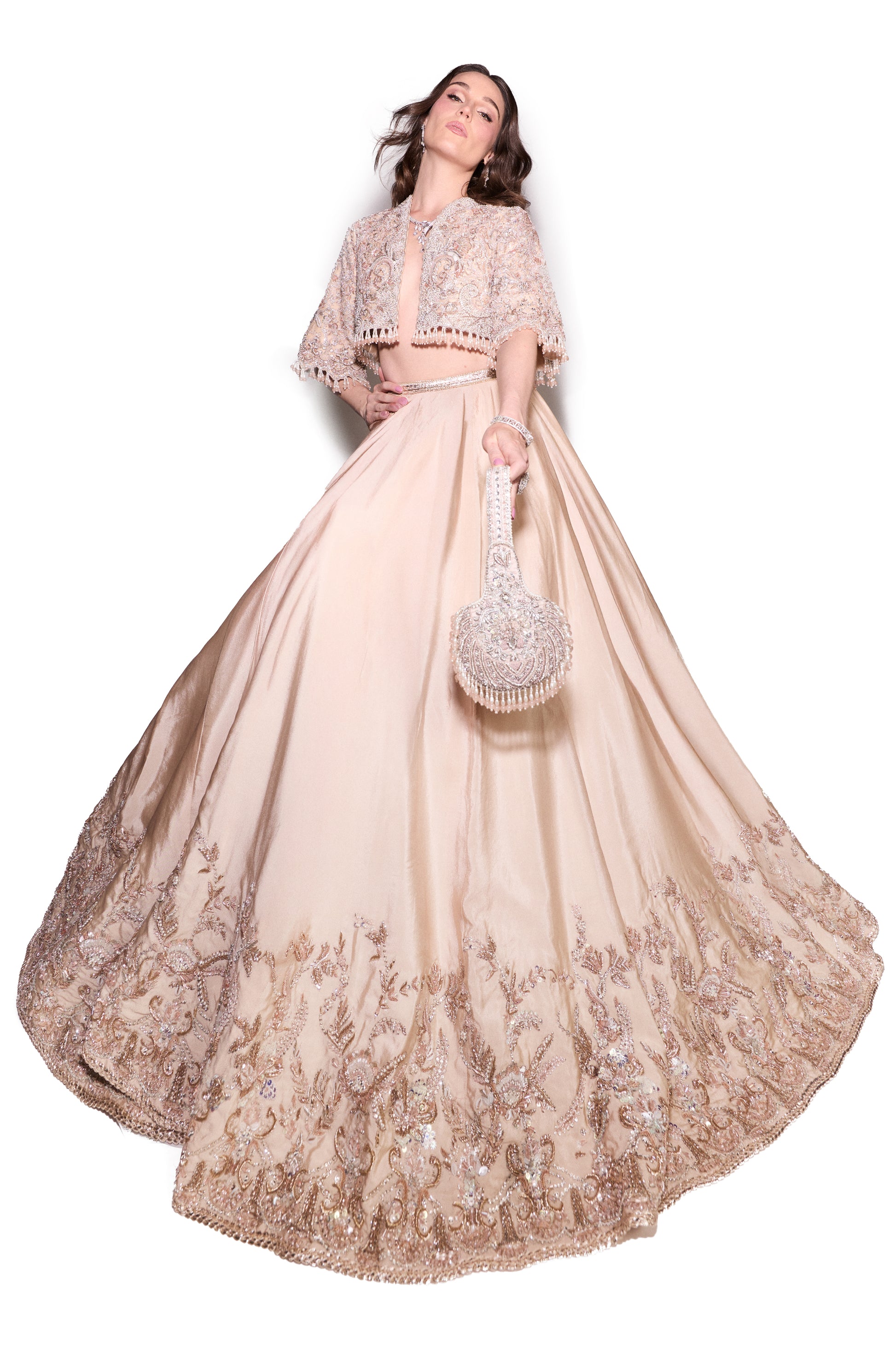Crème de Pêche is a stunning farshi lehenga adorned with intricate floral and gotta patti embroidery, paired with a crop jacket that captures the luxurious hues of sandy shores at dawn. The soft peach and golden tones of the ensemble evoke the serene beauty of the early morning light, while the detailed embroidery creates a beautiful fusion of texture and shine.