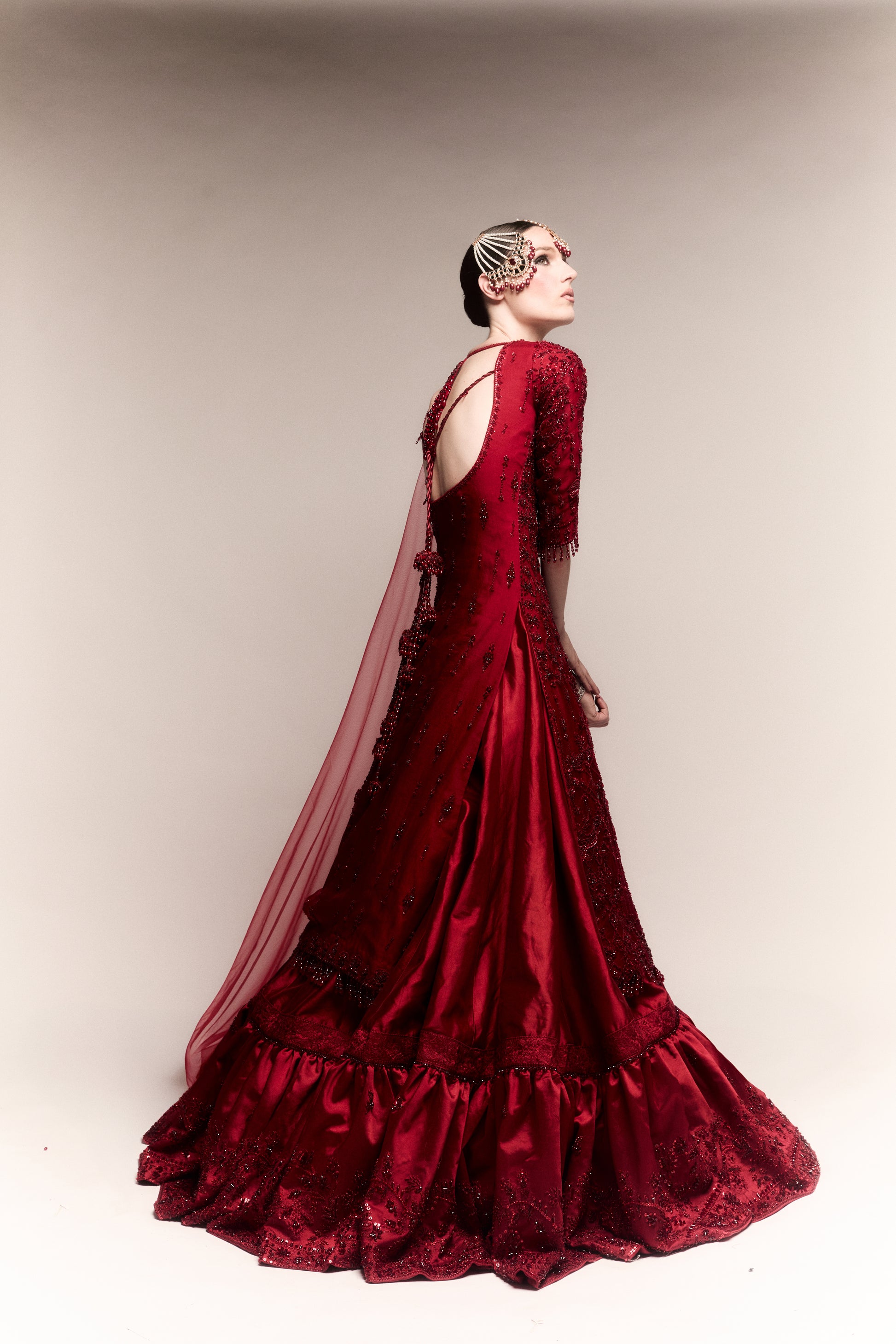 Crimson Veil shimmered with the fire of untold stories. The A-line kameez hugged her with the grace of a promise, its deep neckline leading the eye into a constellation of hand-embellishments—dabka, tilla, cut dana, and Swarovski crystals dancing like fireflies on a midsummer night. Every thread held a secret. Every sequin, a sigh. It was a tapestry of light and longing stitched onto silk that seemed spun from dusk itself.