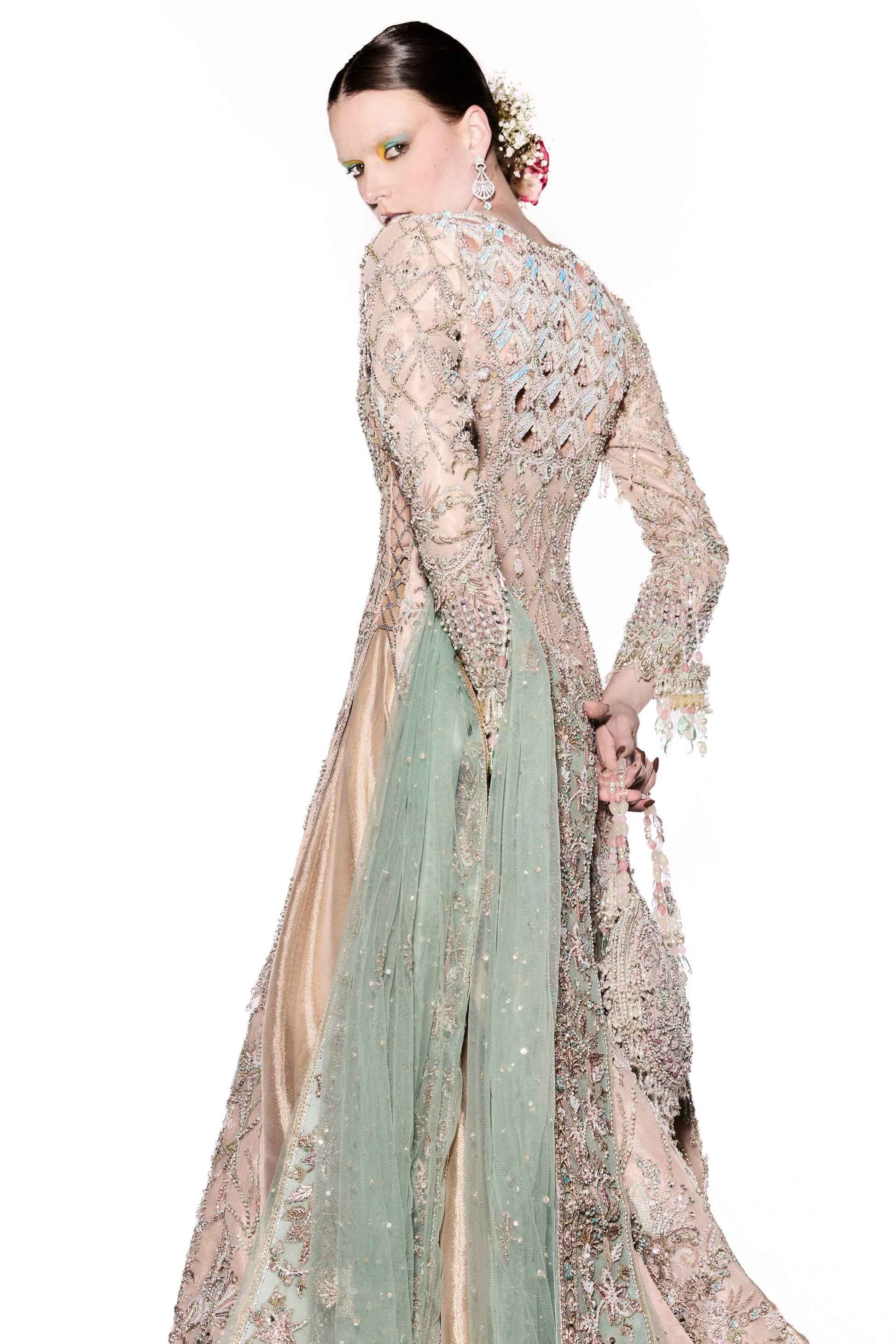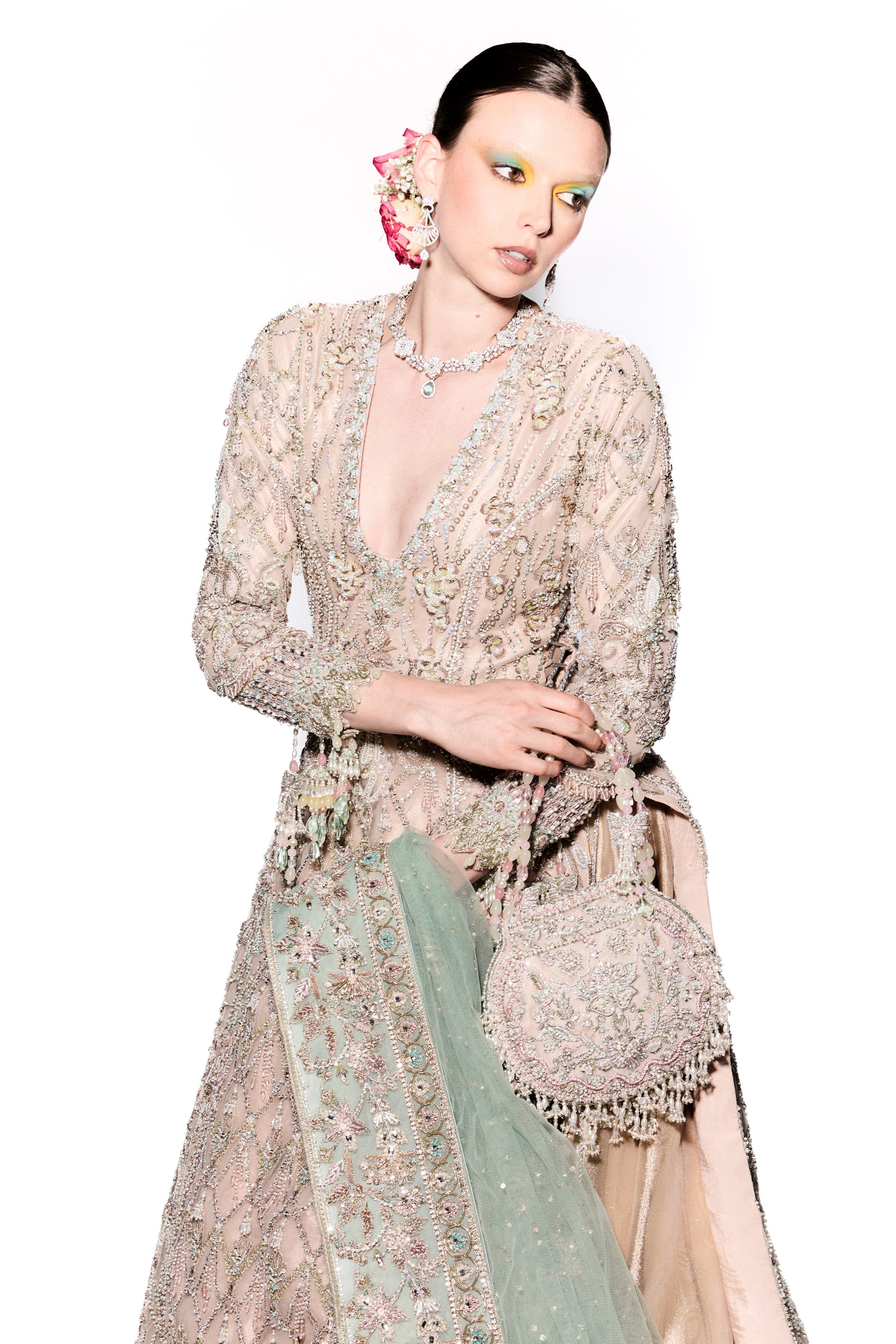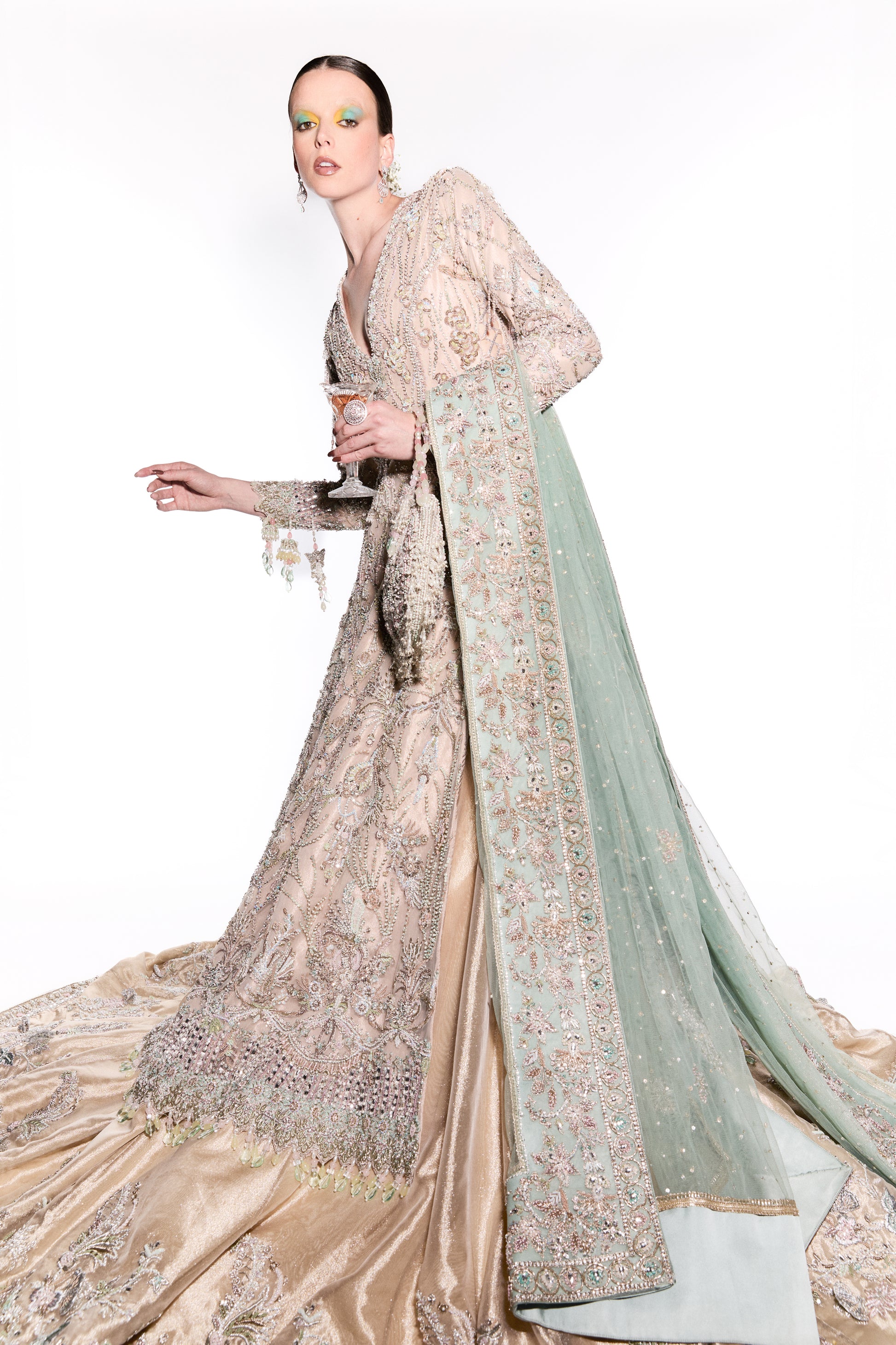 The ivory and gold hues blend beautifully, while the intricate embroidery creates a harmonious fusion of texture and radiance. Sunset Shimmers is perfect for the bride who seeks to shine with elegance, while the 3D butterflies add a magical, ethereal element to this stunning bridal look.