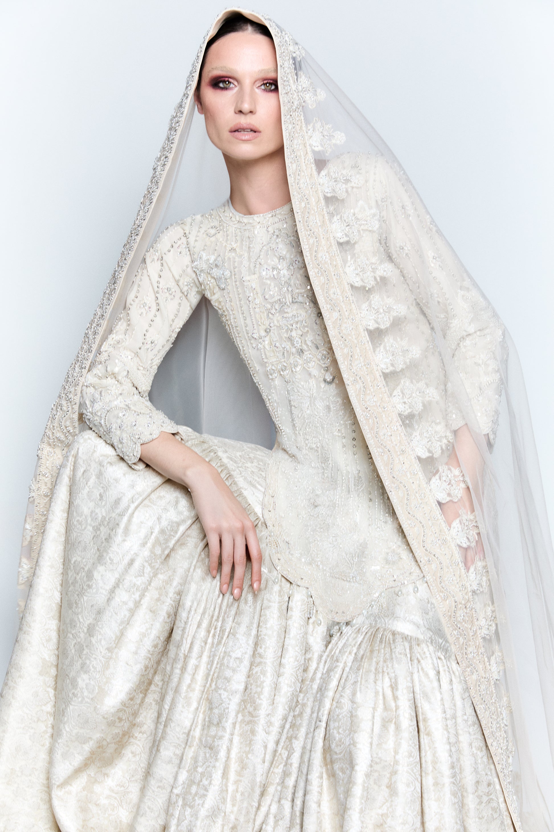 Paired with an opulent jamawar farshi gharara, this ensemble evokes timeless elegance and royal restraint. Like a pearl hidden within an oyster, Moonlit Veil celebrates the beauty of what lies within—soft, sacred, and unforgettable.