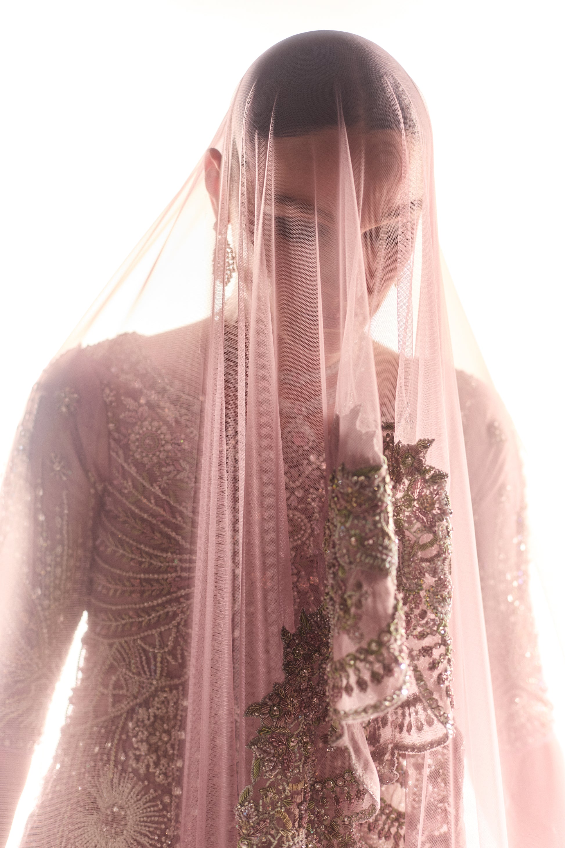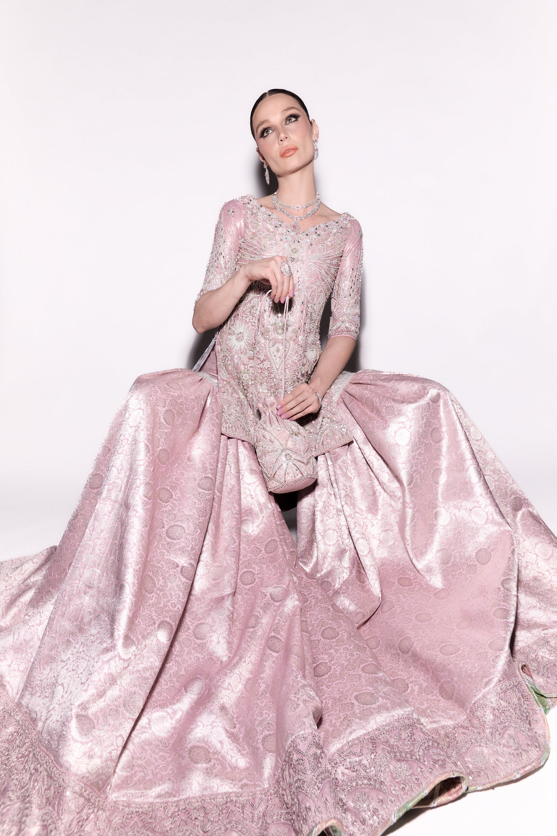 A dusty purple kameez with silver and pastel embroidery, paired with a farshi gharara, inspired by the quiet beauty of a dusky ocean sky. Intricate silver handwork, accented with hints of blush pink, mint green, adorns this breathtaking creation. The ensemble features a luxurious farshi gharara made from delicate jhamawar fabric. Zoraine Ombra adorned with lilac accents and sequinned embroidery, crystal beads, dabka, nakshi, till, Reesham, beaded embroidery, Swarovski crystals . Completing the look, a dupatta with wide, elaborately patterned borders shimmers with regal details.